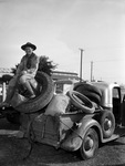 Jack Shannon, 12, Boy Scout of Troop 51, sitting on a truckload of rubber for the rubber scrap campaign being led by President Roosevelt. "Jack Shannon, 13, Boy Scout of Troop 51, mounts the crane on the rear of a rubber collection truck Tuesday night at Magnolia Petroleum Company offices on North Main. The tire on which he sits, and all the rubber on the track are part of the huge pile donated by Fort Worth residents." Jack is smiling and looking into the camera. He is sitting on his haul loaded up on a Ford pickup truck.