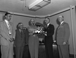 Major General Barton K. Yount. Major General Barton K. Yount receiving floral tribute from A. M. Hall, R. E. Harding, H. H. Wilkinson and William Holden, (left to right).