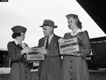 Blood Plasma Bank. Mrs. Roger Owings, and Miss Jospehine Walker are shown with A. A. Lund, general manager of Armour & Company. The two girls are representatives of the Red Cross Motor Corporation.