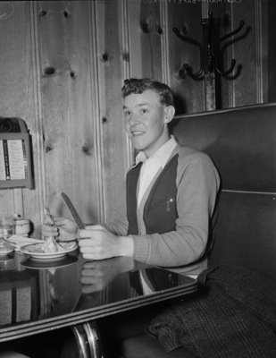 Fort Worth Cats pitcher Wallace Mehrens, is sitting at a dining table, awaiting a steak. The eighteen year old left-hand pitcher threw a shutout last time on the mound. He is wearing a dress shirt, sweater, and trousers.