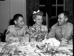 "Bonds for Bombers" dinner. Miss Frances Ann Miller with Private Robert G. North, right, and Sergeant Barnett Shaw, left, of Camp Bowie.