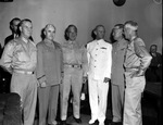 "Bonds for Bombers" dinner. Left to right, Major General Richard Donovan, Major General Barton K. Yount, Major General Dan I. Sultan, Rear Admiral P. W. Foote, Major General John C. Persons and Major General Bruce Magruder of Camp Wolters.