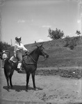 Here is on of the winners of the of Stamford Cowboy Reunion Mrs. Glenn Cooper, on horse back. She is sporting a cowboy attire with a scarf wrapped around her neck. They are standing next to the hill. There is an unidentified man in a cowboy hat and an automobile in the background.