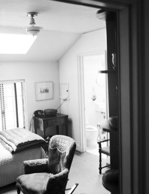 Image shows a interior bedroom at Mrs. Ruth Hare's house. A bed and a chair is shown in the room. The house is a two-story modern Spanish style. There is a balcony on the second floor. Published in the Fort Worth Star-Telegram morning edition March 31, 1940.