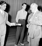 Ray Green (left) is shown receiving the Amon Carter Junior Texas Christian University schoolarship from Amon Carter Senior.