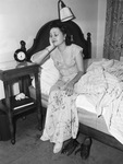 Will take bosses to show at sunrise Saturday. Ho hu. No secretary has to get up this early in the morning. But a lot of secretaries will be turning off the alarm clock about dawn Saturday. So Theda Cook gets in practice to take the boss to that secretary-boss preview of "Take a Letter, Darling," at the Worth Theater. Theda Cook, in a nightgown, watch, and ornate bracelet, sits on side of bed. Next to the bed, a side table has a clock on the top shelf, and book on bottom shelf. A light with lampshade is attached to the center of the headboard and floral curtains can be seen in the background. By her bare feet, a pair of lace-up peep-toe high heel shoes can be seen. Published in The Fort Worth Star-Telegram Morning Edition July 08, 1942.