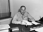 Colonel J. Huntington Hills, adjutant general of Flying Training Command, sitting at his desk. He is wearing his uniform sans hat, slightly smiling as he looks into the camera. He is holding a pencil and several papers in his hands. Several items are lying on his desk, including a fountain pen and inkwell, a name plate, several papers, a magic 8 ball, a telephone, a memo pad, and other miscellaneous items. He is likely sitting at his desk at the new headquarters at the Flying Training Command of the Army Air Force in the Texas and Pacific Building.