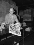 Clive Timmons, mailer for the Star-Telegram. He is sitting on a long table, holding a newspaper and eating a sandwich. Behind him are several tall stacks of newspapers. He is wearing a collared shirt, trousers and eyeglasses.
