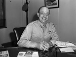 Brigadier General Walter F. Kraus, chief of staff, Flying Training Command, Army Air Force sitting at his desk in the new headquarters in the Texas and Pacific Building. He is smiling a big smile as he is looking into the camera, wearing his uniform sans hat. A few items are lying on his desk, including a bundle of letters, Prince Albert in a can, matches, and other papers. Behind him, his hat is hanging on a coat rack and a poster for an aircraft is hanging on his wall.