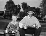 Former Texans were in the limelight last week at the old Greer County Cowboys' Association reunion at Mangum, Oklahoma. Here is Frank Simpson, 82, who went to Magnum, Oklahoma in 1880 with Bar-X cattle owned by Harold Brothers from the Little Wichita River in Archer County, Texas, with his grandson Nordane, son of Mr. and Mrs. J. R. Simpson. Both are sitting next to each other, holding plates of food in one hand and a mug in the other hand. Frank is wearing a striped shirt and a cowboy hat. Nordane is in a cowboy attire sans the hat. They are sitting in front a net. There are automobiles in the background.