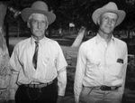 Here are two ranchers who are well known in Texas, although one lives in Oklahoma. Sid Clark of Dodson, Texas, and his son, G. E. Clark of Hollis, Oklahoma, were found at the recent meeting of the Old Greer County Cowboys Association in Mangum, Oklahoma. Both men are standing next to each other, wearing cowboy hats and striped shirts. Sid is wearing a necktie and a chain hanging from his belt.