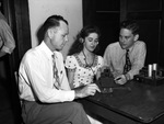 E. B. Coe, Miss Jane Fisher and Marvin Bowles. The three are shown sitting at a table that has a morse code instrument on it. Miss Fisher has a pair of headphones on while Mr, Coe is handling the machine. Mr. Bowles looks on at Miss Jane. Mr. Coe is wearing a pair of trousers and a pattered tie, Miss Fisher is wearing a floral printed dress and Mr. Bowles is wearing a striped, long-sleeve shirt. Beside Mr. Bowles is another morse code instrument.