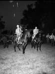 Two unidentified men, possibly Amon Carter, Sr. and Raymond Buck on horseback at Raymond Buck's birthday party. There is a stagecoach in the background with an unidentified young girl seated on it.