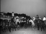 Amon Carter, Sr. and Raymond Buck (left) ride on a stagecoach at Buck's birthday celebration. There are four unidentified men inside the stagecoach, and five unidentified men on horseback to the right of the coach.