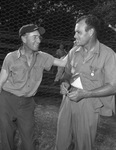 Amateur Baseball is in full swing during the Fort Worth, Texas summers. Standing in front of a chain-link fence, left to right are Puss Erwin and Tex Carlton. Tex is a veteran, right-handed pitcher. His eight years in Major League Baseball were spent with the St. Louis Cardinals, the Chicago Cubs, and the Brooklyn Dodgers. At thirty-five, Tex is retired from professional ball. He is wearing a button-up short-sleeve shirt and trousers. Mr. Erwin is chatting with Tex and enjoying the old baseball stories. He is dressed in a baseball cap, button-up short-sleeve shirt, and trousers.