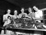 Left to right: Miss Beverly Bird, Mrs. Benjamin L. Bird, Miss Nancy Tomlinson, Miss Charlotte Greene, and Miss Jean Bristol. The five women are shown standing behind a table with a large pile of materials gathered from tailor shops and department stores. Miss Bird and Miss Greene are both holding a piece of fabric while the others look into the pile and pick something out. Each of them are wearing different patterned dresses including, Miss Bird who is wearing a floral printed dress and Mrs. Bird who is wearing a striped dress. The group appear to be smiling and laughing with one another. They have collected more that 1250 pounds of material for government use.