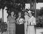 Left to right are Mrs. J. M. Purvis, member of the Garden Center show committee, Mrs. L. S. Sooter, holding one of the prize winning entries, Mrs. Victor Tinsley and Mrs. Robert H. Newsom. They are all wearing dresses. Mrs. Purvis, Mrs. Sooter and Mrs. Newsom are wearing hats. Mrs. Newsom is holding a purse. They are standing under a tree. Star-Telegram Morning Edition July 19, 1942