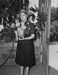 Mrs. Archie Price, president of the Grand Prairie, Texas Garden Club, holding the sweepstakes winner of the 8th annual Garden Center flower show, David Burpee salmon pink zinnias grown by Victor Tinsley. Mrs. Price is wearing a dress and hat. Behind her is a tree. Star-Telegram Morning Edition July 19, 1942