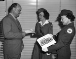 Frank Kent handing a check to Mrs. Roger Owings, Red Cross Motor Corps worker while another worker (woman on right not identified.) shows a picture of a station wagon the Motor Corps plan to purchase with all the donations. Published in the Fort Worth Star-Telegram morning edition, July 16, 1942.