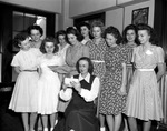 War Chest Campaign workers. First row, left to right, Misses Ann Low, Mary E. Stribling, Cecilia Epstein, Ruth Blackersby, Reba Faye Mitchell and Cheryl Watson. Back row Misses Loretta Knight, Virginia Brignac and Madeline Clark and Mrs. Rita Page. They are grouped around Mrs. Alice J. Schopmeyer.