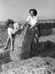 Miss Mary Edwards and Miss Maryanne Smith of Colorado Springs, working in a hay field.