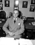Francis V. Thomson, executive director of Fort Worth Community Chest, has been selected as director of the War Chest drive, a combined appeal for 12 war relief groups and the Community Chest, representing 26 agencies. He is a veteran of 30 years' experience in social welfare work, Thomson was made executive director of the Community Chest in April 1939. He has directed three Community Chest campaigns, two of which have been over-subscribed. He came here from Chicago in 1934 to become director of the Panther Boys' Club. Before coming to Fort Worth, Thomson was engaged in boys work at Chicago, New York and Washington, D. C. In this picture, Mr. Thomson is sitting at a desk. Behind him is a table with a radio, books, and a wall full of portraits of men. He is wearing a light colored suit and eyeglasses. Published in the Fort Worth Star-Telegram morning edition, July 16, 1942.