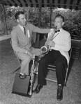 Swift and Company employees are attending a family party at Will Rogers Memorial Auditorium. Sitting outside underneath a tent are Hathaway Davis, left, and Raymond Swartz. Mr. Davis is dressed in a double breasted suit with a "reception" ribbon pinned to his lapel. Mr. Swartz is an employee at the plant and a member of the Cantrell's Commodores, who are furnishing the musical entertainment for the party. Mr. Swartz is shown tuning his saxophone. He is dressed in a tuxedo with a white blazer and dark pants.