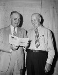 Swift and Company employees are enjoying a family party at Will Rogers Memorial Auditorium. Attending the party, left to right, are J. H. Hall and A. J. Fifer. Mr. Hall is the general manager of the company. He is dressed in a suit with a "reception" ribbon pinned to the lapel. Mr. Fifer is the firm's oldest plant pensioner. He is wearing a dress shirt, necktie, and trousers. The men are shown inspecting a Swift program.