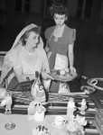Mrs. W. E. Kemble, of Arlington Heights Christian Church, and her daughter, Miss Cherry Kemble, inspect one of the exhibits at the World Affairs Festival on the Texas Christian University campus. Miss Kemble is wearing a dress and Mrs. Kemble is wearing a blouse, skirt and veil, and is holding a bowl. She is sitting at a table. On the table are several figurines and a bottle. Star-Telegram Morning Edition July 22, 1942.