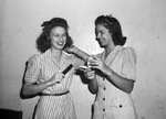 Miss Doris Rogers and Miss Dorothy Bryant applying makeup before a Little Theater play.