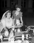 Mrs. W. E. Kemble, of Arlington Heights Christian Church, and her daughter, Miss Cherry Kemble, inspect one of the exhibits at the World Affairs Festival on the Texas Christian University campus. Miss Kemble is wearing a dress and Mrs. Kemble is wearing a blouse, skirt and veil, and is holding a bowl. She is sitting at a table. On the table are several figurines and a bottle. Star-Telegram Morning Edition July 22, 1942.