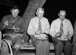 Left to right are Clyde Thate, T. J. Allen, and County Farm Agent D. D. Steele, enjoying a meal at a meeting of the Coleman County Breeder-Feeder Association at Gill Ranch near Whon, Texas. They are sitting on a bench in front of a tree, holding plates of food. All three men are wearing button-down shirts, trousers and neckties.