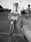 W. S. Margowski, chairman of Selective Service Board Number 6 was one of the first to be issued a purchased certificate for a Victory bicycle under bicycle rationing. However, he is returning the bicycle rationing certificate back to the county war price and rationing board. He has passed up the new Victory bicycles for the free wheeling, knee action, hand brakes, and chromium plating of a second-hand bicycle (unrationed). Mr. Margowski is balancing on a bicycle with one foot on a pedal and the other foot on the curb. He is wearing dress shoes, light-colored socks, slacks, a checked button-up shirt, a striped tie, and a straw hat. Published in the Fort Worth Star-Telegram morning edition, July 23, 1942.