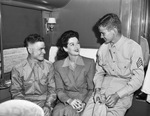Corporal Gordon Anderson of Minneapolis, Minnesota, left, and Sergeant Robert F. Jackson of St. Joseph, Missouri, with Rosalind Russell.
