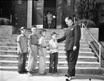Left to right, the boys are Jimmy Courney, Bobby Ray Bingham, Jimmie Lee Brown and Jerry Singer. Frank Weatherford is giving the boys their sendoff as they leave for camp.