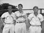 Amateur baseball players (left to right) Sam Norwood, Jay Bloomer and Dave Cashion. The three players are standing beside each other in front of a wire fence. Each of them are dressed in their respective team's baseball uniform; Norwood's and Cashion's jerseys both say "Hamms Beer" across the front, while Bloomer's jersey says "Bombers," of the Consolidated Aircraft team. The men are standing with their hands behind their backs and are smiling.