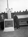 Dedication of Bruce Field at Ballinger, Texas. Doctor J. E. Smith, left, Claude R. Stone at right of plaque, and Reverend Clarence A. Morton, Baptist pastor in background.