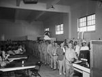 A scene from the Quartermaster Depot Cafeteria. Shown with loaded trays, Colonel W. J. Calvert, Major McCrary, Colonel John S. Chambers, standing right to left.