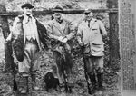 Copy of an Associated Press photo of Jesse H. Jones and two unidentified men on a hunting trip. The three men are shown standing outside, wearing hunting gear and holding rifles. Mr. Jones has two large birds strung around his neck while one of his companions is holding another animal. Between the two men is a small dog and behind them are two trees. This photograph is a copy of a photo that was loaned to the Fort Worth Star-Telegram by the Houston Chronicle.