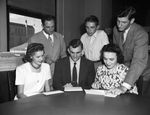 Travis Avenue Baptist Church is planning the nineteenth annual Young People's Encampment. The event is being held in the Woodlake Camp Grounds near Denison, Texas. Board members are making final preparations. Seated, left to right are, Miss Katherine Shamburger, Ed Smith, and Miss Nannie Lou Williams. Standing are, Volus Norsworthy, Bobby Norsworthy and Jimmy Erwin. Miss Shamburger is the camp secretary. She is wearing a necklace and a light colored button-up dress. Mr. Smith, recreational director, is dressed in a striped suit. Miss Williams, assistant camp director, is wearing a floral dress. Mr. Norsworthy, camp director, is dressed in a double breasted suit. Bobby, camp bugler, is wearing a button-up shirt with a windowpane pattern, and trousers. Mr. Erwin is the swimming supervisor. He is dressed in a suit.