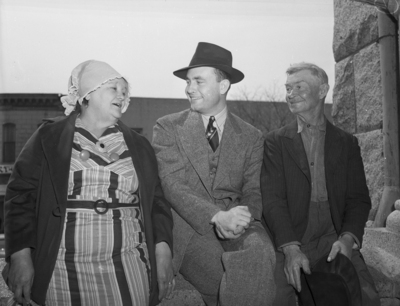 Wise County Oil discovery. Oil play, set off by recent deep discoveries in clay and Montague Counties, has spread to Wise County, which is enjoying it's biggest play in history. Here in the picture is Wise County Judge Harlan Brown, center, talking with Mr. and Mrs. C. O. Urquhart of Greenwood.