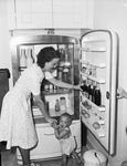 Mrs. R. H. Foster and son, Bob Junior, looking in the ice-box.