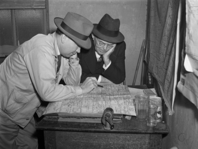 Studying a Wise County Map are J. M. Scott of Decatur, land owner, left, and John W. Glahn of Fort Worth, land man in the district for the Indian Territory Illuminating Oil Company.