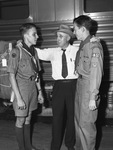 Scout Stewart Cecil, left, of Troop 17, and Scout Lewis McLendon, right, of Troop 4 and 52, shown as they were leaving for a month's training course at Philmont Scout Ranch in New Mexico. W. D. Cecil, center, father of Stewart, is bidding the boys farewell. Stewart and Lewis are wearing their scout uniforms. Mr. Cecil is wearing a long-sleeve collared shirt, paisley print necktie, a hat, trousers and eyeglasses.