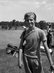 Charley Royer, 17-year-old golfer, was the junior medalist at Meadowbrook Golf Course on August 3, 1942. He fired a 68 on the par 71 layout. He is standing on the golf course, carrying a bag of golf clubs. He is wearing a striped t-shirt and trousers.