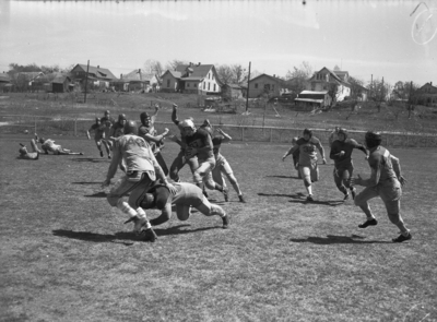 One of the prettiest runs in Texas Wesleyan College (TWC) spring football game with the Ram "exes" came late in the fourth quarter. Here, Graham Kyle of the Rams is shown getting started on an 18-yard gallop as Dutch Alford clamps a block on the exes' Moran Mote. The exes coming up from behind are Ben Fowler, extreme left, and John Bray.
