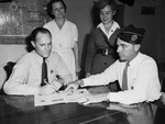 American Legion Navy Station. C. L. Lemons, seated at left, and Joe W. Arkins, right. Standing is Mrs. L. W. Mendenhaff, left. Audrey Owing of the Red Cross Motor Corps standing at right.