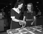 New shopping hours. Mrs. Gertrude Blankenship, left, and Miss Lois Parr, buying hose.