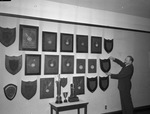 Scrap Metal Campaign. R. Seibel shown with plaques to be donated to scrap metal drive.