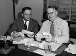 Mark McGee, right, State Office of Price Administration (O. P. A.) director, and Jack F. Reid, state rationing officer are reviewing speeding tickets. "Double trouble now faces the Texas motorist who gets a ticket for speeding on the highways. [S]he may (1) be fined by the courts, (2) forfeit [her]/his chance to get new tires when [her]/his old ones wear out. State O. P. A. Director Mark McGee and Jack F. Reid, are shown here as they look over the first big batch of speeding tickets sent [to] them by State Highway Patrol. Speeding is regarded by the tire rationers as evidence of tire abuse." The duo are sitting at a desk, side by side, and both are gazing at the tickets in Mr. McGee's hands. Mr. McGee is wearing a light-colored pinstripe suit with peaked lapels, a light-colored button-up shirt, a geometric-patterned tie, no wedding band, and spectacles. Mr. Reid is wearing a darker-colored suit with peaked lapels, a light-colored undershirt, a wedding band, and a dark-colored tie. Some of the items lying on the desk are a fountain pen and inkwell, writing utensils, several documents, a letter, other paperwork, an ashtray, and a dish of paper clips. Office buildings are filling the view of the window behind them.